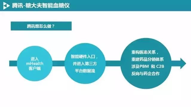 腾讯自己推出“糖大夫”血糖仪是一款主要用来做糖尿病管理的智能硬件产品,配备了彩色显示屏,操作方式与智能手机类似。糖大夫实现了与微信的联动,在开机时,糖大夫会提醒用户扫描二维码并绑定微信账号,此后会有微信公众账号推送测试结果和定期测试提醒给用户。