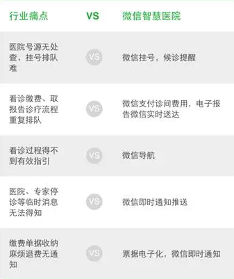 2014年上线的微信智慧医院,以“公众号+微信支付”为基础,结合微信的移动电商入口,用于优化医生、医院、患者以及医疗设备之间的连接能力。整个流程包括微信预约挂号,候诊提醒;微信导航,诊疗室和化验室之间的有效指引;微信支付诊间费用,电子报告微信实时送达、离开医院后的医嘱提醒等。
