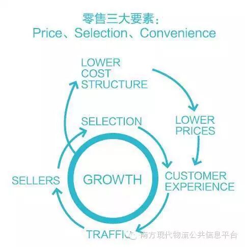 这是京东决定做O2O切入路径层面的逻辑,还有一个更加基础的逻辑,这个是本源性元素。再看第二张图(见下页),这张图是亚马逊的创始人贝索斯在1997年手绘的,它揭示了亚马逊今天作为一个将近2千亿美金的公司发展的原动力。