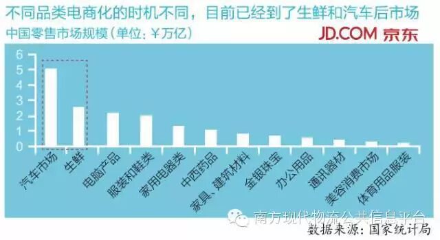 大家再看我们自己做的这张图,这是我们结合国家统计局的统计数据和各个投资银行对于整个中国零售消费结构的数据做出来的。结果出来之后吓了一跳,和前面的图惊人一致。前面那张图是2007年的,这张图是今年的。但它们几乎揭示了同样的道理,整个社会零售过万亿的品类只有6个,而最大的两个就是到今天为止仍然没有被电商化,就是汽车和生鲜。