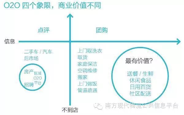所以我们把当前所有O2O的公司分在了这四个象限当中,比如说通过信息来产生一个到店行为的有大众点评,美国有TripAdvisor和Yelp。全世界这类的商业公司加起来整个市值差不多200亿美金左右。右上角的团购,美国有groupon和livingsocial,中国有美团、窝窝团,加起来差不多是200亿美金,这两个市场都在跌。左下角更多,像原来的传统58同城、赶集、安居客等等。大家可以发现,左下角的公司会非常快速做集中化,这些公司会大鱼吃小鱼,可能中国未来只有极少数这样的公司。因为不到店的信息层都是相对比较轻的交互,这个地方是最容易产生赢者通吃的局面。这个领域的市场价值可能也就在200亿美金左右。但是你会发现好多别的象限的公司却开始在做右下角的事,你想想这几个公司的动作,美团在做外卖,58同城在做58到家。
